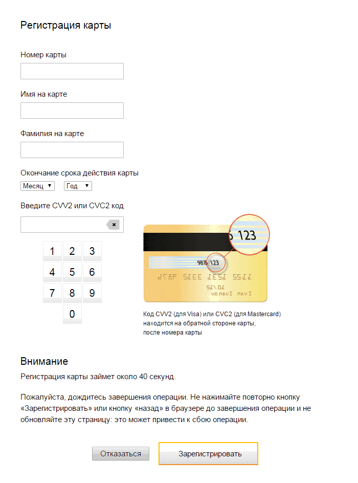 Если вы согласны с оплатой через вашу карту, нажимайте ссылку «привязать карту». Вам предложат заполнить форму, в полях которой нужно указать реквизиты, которые находятся на лицевой стороне вашей Visa или MasterCard: номер карты, имя, фамилию, срок действия. Также укажите трехзначный CVV-код, который находится на обратной ее стороне. Проверьте правильность введенных данных и жмите «зарегистрировать» карта пройдет проверку в короткое время, не надо при этом ничего нажимать или обновлять браузер, это может привести к сбою данной операции.